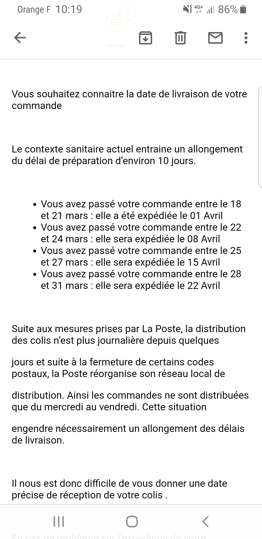 Posté le 19/01/2019 à 15:09"Voici le délai de livraison J'ai commander 7 articles j'en reçois de 4 car les autres articles ne sont pas utiles selon eu. Je vais recevoir ma commande 1 mois après lavoir passer par contre j'ai été débiter moins de 1 semaines après. Impossible d'annuler car soit disant elle est en cours de préparation. C'était ma première commande mais bien ma dernière."